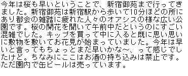 新宿御苑は徳川家康の家臣、内藤氏の江戸屋敷の一部が元となっています。明治39年に皇室の庭園になり、戦後昭和24年に国民公園として一般公開されました。広さ58.3ha、周囲3.5q