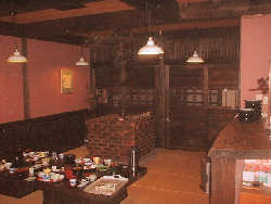 朝御飯は左下の食堂でいただきます。囲炉裏と掘りごたつ風の席がいいです。朝食は山菜や豆腐など野菜中心で牛乳がうまかったです。