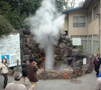 隣接の龍巻地獄は別府市指定の天然記念物で約25分ほどの周期で熱湯を吹き上げる「間欠泉」です。yosiは噴出がちょうど終わった後だったので20分位待ってしまった。段々席で待つことしばし、だんだん増えた観客の見守る中、突然猛烈に噴出し出しました。