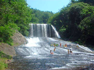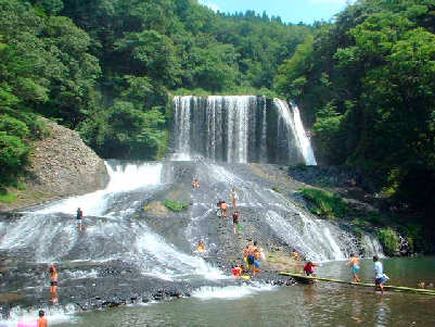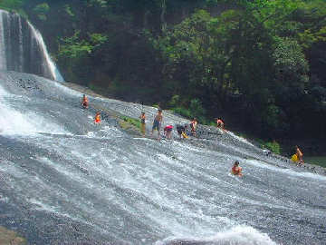 のんびりと朝から温泉につかり朝ご飯をいただいたあとはバスに乗って豊後森に向かいます。ここから龍門の滝に行ってみようと思います。龍門の滝は大分県久重町松木にある玖珠川の支流松木川にある高さ20m、幅40mの滝です。豊後森から龍門の滝に向かうバスはちょっと時間があるのでタクシーで行くことにしました。(¥1780)今日は30度を越える暑さということもあって子供たちがたくさん滝滑りを楽しんでしました。ちゃんと滑り袋といって肥料の入っていたビニール袋を¥100で売っていてそれをお尻の下に敷いて滑るのですがとても楽しそうです。大人も中にはいましたがちょっと恥ずかしいですねぇ。ここはキャンプ場にもなっていてバンガローに泊まって遊ぶことも出来ます。