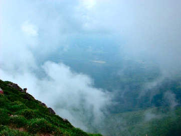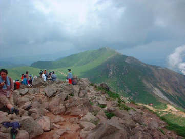 中岳との分岐点を過ぎるといよいよ久住山への登りとなります。真夏の暑さと闘いながら岩場を登ると山頂は既にたくさんの登山者でいっぱいでした。なぜか犬もいました。(≧∇≦)雲を眼下に素晴らしい景色を眺めながらお昼ということになりました。ε-(´o`;A アチィ