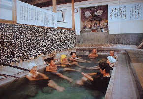 左のような浴槽が2つあって隣にダルマストーブのある3畳ほどの暖房室があります。皮膚病やリューマチ、胃腸病などに効能があるそうですが、 yosiもがんばって入りました!最初に首までつかるのは夏で登山直後でも気合が必要でした。たしかにしばらく我慢すると結構入れますが10分くらいでしたね〜。外に出ても震えが来ていました。左の写真の左上に「歌」が書いてあるんですが、笑えました。メモしとけば良かったです。
