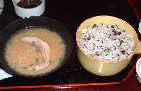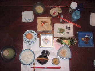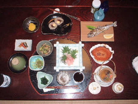 食事は別室の個室でいただきました。お客さんが他に1組だけだったからかもしれませんが。食事もやはり既製品は使わないそれぞれ凝ったものが出てきます。鯉の刺身、ヤマメの塩焼きなどで左の写真で三角形のお皿のものは「水前寺のり」という清流で採れる天然の淡水のりで味はほとんどないですが、良質の炭水化物、蛋白質、ミネラルを含む貴重な自然食品で少し前にテレビで「みのも○た」が紹介していました。非常に貴重で大女将の話では天然記念物だとのこと。昔はあちこちあったそうですが今は日本で数カ所でしか取れない貴重なものです。