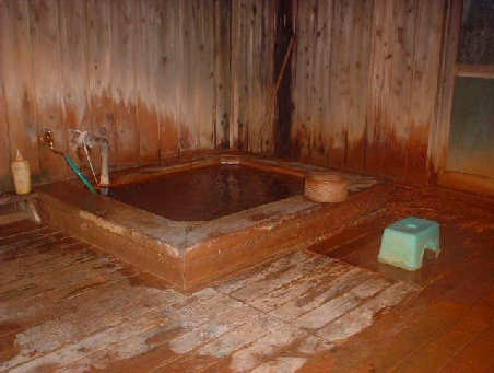 小野屋のお風呂は家族風呂が1つあるだけです。建物と同じでこれまたかなり古びた感じで人によって好みはかなり分かれるかと思います。当然シャワーなどはなし。浴槽もそれほど広くはありませんが、含亡硝重炭酸土類泉ということで茶色っぽいけど臭いはあまりない泉質です。きりきずなどに効能があり、飲むと痛風に効くとか。