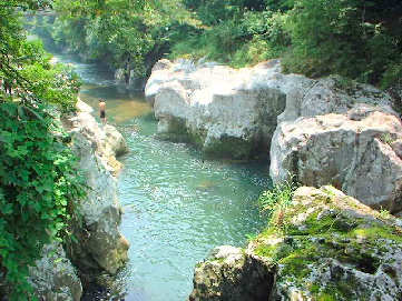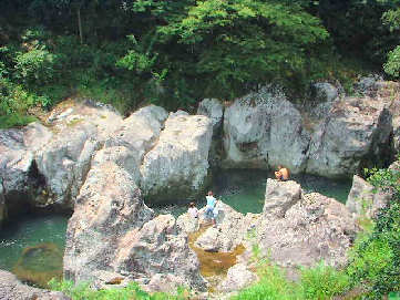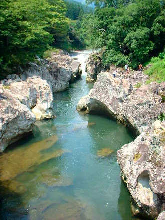 千壺峡は猿飛甌穴群とも言われ、長い年月をかけて川の流れで侵食された無数の甌穴が広がる光景が見られ、国の天然記念物に指定されている。猿飛の名は野猿が奇岩群を飛び交ったこと、または甌穴が猿の飛び交った足跡ににていることからとも言われます。真夏のカンカン照りということもあり若者グループは高い岩からダイビングをしておりました。