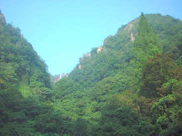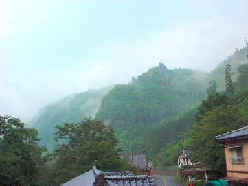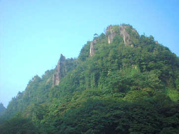 バスを降りて茶店で一休みしていると突然のにわか雨になりました。とりあえず宿に逃げ込んで雨のやむのを待つことにしました。1時間ほども降り続いてようやく小降りになったのでかさを持って宿のそばにある名所「一目八景展望台」へ。ここからは1つの地点から8つの奇岩を見ることが出来て紅葉の季節には多くの観光客でにぎわいます。川沿いに設置された展望台からは、雄鹿長尾ノ嶺、嘯猿山、烏帽子岩、仙人岩、海望嶺、群猿山、夫婦岩、鳶ノ巣山がぐるりと眺望でき、足下のプレートに書かれた奇岩、奇峰の名前を見ながら、自然の雄大さとその造形美を堪能することができます。