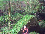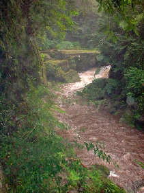 一目八景から県道を5分ほど歩いたところから山移川を渡ると渓谷に沿って遊歩道が伸びています。「麗谷」と書いて「うつくしだに」と読むそうです。普段はキレイな清流なのですが先ほどのにわか雨で茶色く濁った濁流となってしまって少し残念。おまけに既に6時近くなってしまい昼間でも薄暗い場所なので写真も今一歩の出来ですが、ゴロゴロ転がっている大きな岩や樹、それらを一面覆っている緑のコケがキレイでした。以前の台風の影響で遊歩道も途中で行き止まりとのことでしたが夕飯の時間も迫ってきたので行ける所まで行ってみることにしました。秋の紅葉は語るまでもナシです。