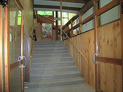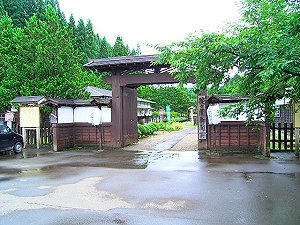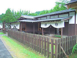 箱根のような幕府の関所のようではなく物資、人の移動に税金をかけて津軽藩の資金源としていた様です。当時は上の番所(峠の番所)、中の番所(折橋の番所)、碇ケ関の大番所の3重になっていて、ここは昭和59年に中の番所の場所に復元されたものです。建物は2つあって、1つは上番所、下番所、女改めの部屋、展示室、土間などに区分されたもの、もう一つは足軽番所ですが、こちらは中は食堂とおみやげ物屋さんになっています。 |