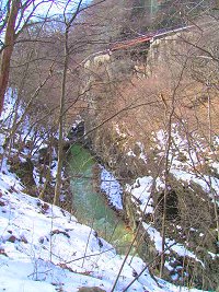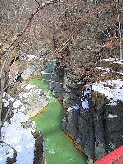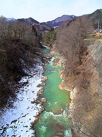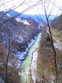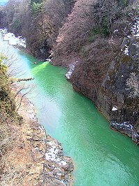 岩島駅から国道145号線を川原湯方面に歩いていきます。舗装された平坦な道ですが、風が冷たい。車も結構通ります。吾妻川はすぐ脇のはずですが道路からは見えないでいましたが、20分程歩いていくと左側に吾妻川にかかる大きな橋がありました。橋の上から川を覗くと崖の下に緑色の吾妻川が流れていました。川の色は青かったり緑色だったり不思議です。吾妻川はもともと強酸性の川で魚も住めなかったそうですが、昭和30年代に中和工場が出来て飲める水になったんだそうです。