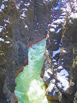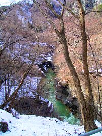 れも急でなかなか迫力があります。切り立った崖は元々強酸性の水だったためか水際が茶色に変色しています。ダムが出来てもこの辺りは文化的な面から保護され水没は免れる様ですが、水量とか今のような自然な風景は無くなるのかもしれません。再び川原湯方面へ遊歩道を進みます。遊歩道と言っても斜面に沿った細い雪道が続きます。一部雪が凍っている崖のような箇所もあり手すりを頼りに通りました。この時期はこの遊歩道は誰でも気軽に通れる道ではないようです。