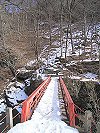 沢を渡り山の斜面を登りきったら眼下に赤い橋が見えました。歩道らしきものも見えます。しかしそこまでは雪の急斜面で降りれそうな道もなく岩の絶壁に沿っていけばいいかと進むと凍った道はいよいよ狭く落ちたらヤバそうです。ここは勇気をもって撤収、と思い少し戻ったところでなんとか下に降りれそうなルートを見つけました。看板を見ると「鹿飛橋」という吾妻渓谷の最も人気の場所だと分かりました。遊歩道の終点でもあります。ここから遊歩道が川原湯温泉駅まで続いています。