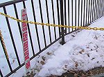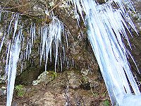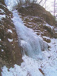 見晴台から川原湯までは看板によると1q、25分とありました。既に1時だったので急ぐことにしました。途中の遊歩道は相変わらず雪が凍って大きなツララもあちこち垂れ下がっています。途中、滝が凍っていました。自然の力はスゴイですね。