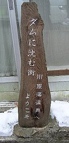 吾妻渓谷には遊歩道があるとの情報を聞いていたyosiはその入り口を聞こうと通りかかったおぢさんに聞ききました。「歩ってくのか?、それならこっちからでも行けるけどまだず〜っと先ダ」と言われトボトボ集落の中の道を歩きました。途中、湯気が見えたので「なんだ?」と思ったら「天狗の湯」とかいう温泉施設で、ダムの地元対策施設だそうで地元の人しか入れません、と書いてあったので諦め、またテクテクとダムの工事現場の中を歩きました。さすがに大掛かりな工事です。祭日のためか作業はあまりしてない様でした。