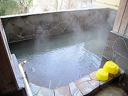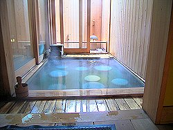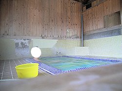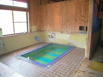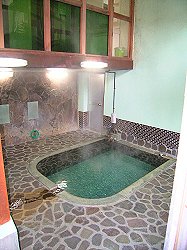 砂風呂を出ると浴衣を脱いでシャワーを浴び汗と砂を流します。休憩室で薬茶を飲んで地下にある内湯に向かいました。ここの泉質は「含硫黄−カルシウム・ナトリウム−塩化物・硫酸塩温泉(中性低張性高温泉)」で、2つの源泉からの混合となっています。無色透明のほのかに硫黄臭のする柔らかなアルカリ泉(ph7.1)は気温のせいかややぬるく感じ(源泉温度71.6℃)ましたがのんびり入ることが出来ます。露天風呂は1F奥にあり、砂利湯(男湯)と寝湯(女湯)の2つがあります。宿の人に聞くと昔は日替わりで入れ替えていたそうですが、間違える人が多く、今は固定しているそうです。露天風呂は有料の貸切りで入ることは可能ですが今回はあきらめることとなりました。砂利湯は実際には砂利ではなく、大きな丸石が幾つか沈んでいるお風呂です。割とキレイですが塀に囲まれて開放感はあまりないかもしれません。(システム料金詳細は宿のHP参照下さい)