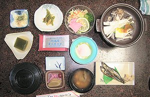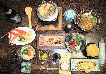 山菜釜飯、鹿陶板焼、カニ、刺身、カキ、エビスープなどなど