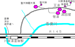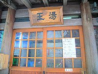 宿を10:00にチェックアウトしたのですが、帰りのバスは3時ということでそれまで共同湯巡りをすることにしました。高田屋に宿泊するとすぐそばにある共同湯「王湯」の入浴券をもらって入浴することができます。川原湯温泉は源頼朝によって開湯されたという説があり、王湯の玄関には源氏の紋所の「ささりんどう」が大きく描かれています。ここの源泉が川原湯温泉の各旅館へ運ばれているわけです。営業開始の10:00に早速行ってみるとyosiが一番乗りでした。玄関を入るとすぐ受付がありおばちゃんが番をしています。休憩室もあります。その下が男女別内湯となっており、さらに渡り廊下を通っていくと男女別露天風呂もあります。最初に内湯に行ってみました。なかなか古い湯治場の雰囲気が最高であります。脱衣所から階段を降りていくと10人くらい入れる湯船がキレイなお湯をたたえていました。湯加減もちょうど良く最高のお湯を1人占めしました。昔の湯治場の旅館はお風呂は無くお風呂だけこうした共同湯に入るというのが多かったらしいです。
