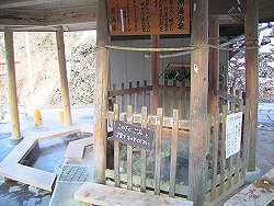 冬は7:00からと書いてあったので6:30頃行ってみるとまだ掃除のおぢさんが掃除中でした。当然湯舟は空っぽ。7:00位になってようやく掃除を終えたおぢさんは「1時間は掛かるよ」と。浴衣一枚で待っていましたが、やはりなかなか溜まりません。朝食の時間もあるのでやむなく10pほど溜まったとこで入りました。当然横になってですがそれでも浸かれない状態。早々に引き揚げることにしました。後から2人ほどやってきましたが諦めて帰っていきました。源泉は川原湯温泉新湯で他と似た泉質です。そばには由来となった聖天様が祭られていますが、精力増強の信仰でお供え物もなんだか。。。この露天風呂はメイン道路から階段を数十段上がった高台にあり、混浴です。入口の箱に100円入れて入るようになっています。