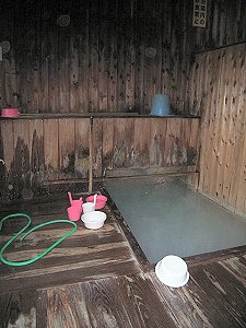 まずは内湯です。内湯の前に貼ってある温泉成分分析表によると、ここのお湯は隣にある中の湯(共同湯)から引かれているとのことで単純酸性硫黄泉、源泉温度は79.2℃、ph値は2.6の強い酸性泉です。内湯は男女別の2m四方位の木製の浴槽で広くはないですが雰囲気があります。お湯は白く濁り硫黄の匂いが鼻をつきます。湯温はこの日はかなりぬるめに感じました。