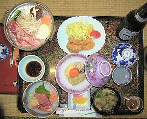 宿に着いたのは8時頃で普通の食事の時間はとっくに終了していましたが、夕食を残しておいてくれました。朝夕共に1Fの広間で頂きますがこの部屋もなかなかの雰囲気です。夕食はお刺身にジンギスカン、エビフライ、ロールキャベツと料金に比べスバラシイです。お刺身も新鮮で煮物もキチンと造られていました。