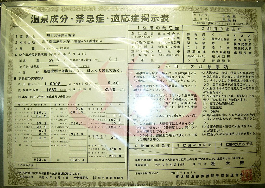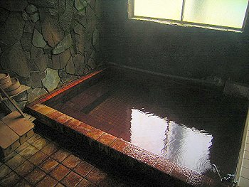 ところで、畑下温泉は塩原温泉郷の中程に位置しており箒川が大きく蛇行する渓谷沿いにあります。古くから有名で、かつては尾崎紅葉が「金色夜叉」をこの地で執筆したこともあります。最近バイパスが出来るまではホントに川の流れる音しかしない静かなところだったそうです。この宿の泉質は他の多くの塩原温泉郷の温泉と同じ食塩泉(ナトリウムー塩化物泉)で源泉は畑下元湯共有源泉です。(源泉温度:57.6℃、ph:6.4)神経痛や筋肉痛、冷え性などに効能があります。宿には男女別の内湯が1つずつあるだけですが、タイル張りの浴槽は鉄分が豊富なお湯のため茶色に変色し適温の透明なお湯が溢れています。