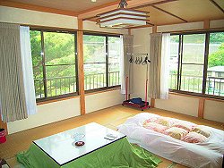 早速部屋に案内され2Fの角部屋に通されました。部屋は10畳の広さで2面から箒川の流れを眼下に見下ろすことが出来、ナカナカのお部屋です。寒いこの地方のためコタツとガスストーブも置いてありました。外から鍵を掛けられない事や「テレビのリモコンが古いので…」という点もご愛嬌です。ご主人がいろいろご丁寧に説明してくれるのも好感が持てます。