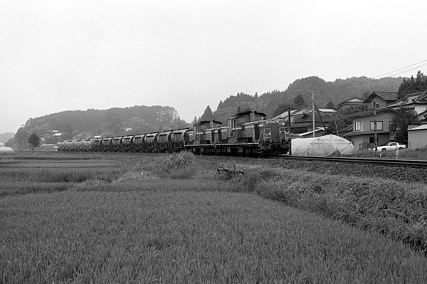 昔の鉄道ファン誌で見たD60の活躍が印象に残る路線でした。DD51が重連で貨物を牽いているらしいと噂に聞いてはいましたが、ある日貨物時刻表というものを手に入れ、運転時刻も分かってきたので夏の終わりに立ち寄りました。昔の蒸気時代の写真では風光明媚な中を走る印象があったのですが、いざどこで撮るかというとなかなか時刻表の地図から判断するしかなかった当時は難しかったです。結局適当な場所で待つことしばし、重連の貨物列車がやってきました。周りに家もあったり貨車も少なく満足ではありませんでしたが、どうにかカメラに収めることができました。2000/3に大越~郡山の貨物列車は廃止されてしまいました。 |