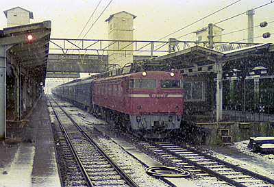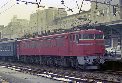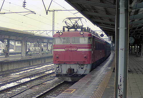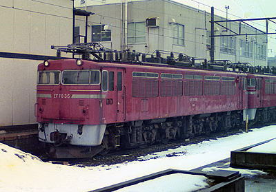 EF70といえば私が初めて購入したNゲージだった訳ですが、実車は、と言えばあちこちに大量留置されている、印象の薄い機関車でした。僅かに残る運用がいよいよ無くなると聞き、居てもたまらず雪の北陸に向かったのは高校2年の三学期のことでした。期末試験も間近というのに新聞配達のバイトで得た資金を使って北陸ワイド周遊券を購入、夕方の急行信州で出発しました。宿は夜行急行で周遊券内往復と駅の待合室だったと思います。