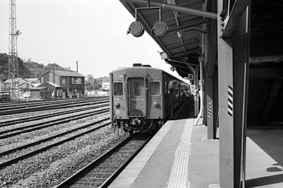 キハ66 2他普通 原田 1990/3/14 雨模様のどんよりした雰囲気の中発車を待ちます。 |