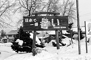 下川駅前の看板 1989/2/13 「日本で一番「さむい」町」とフリガナされてます。 |