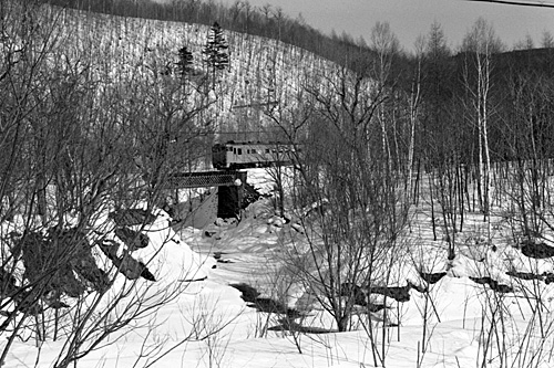 Ⅲ 一ノ橋にて 一ノ橋には8:52到着。次の遠軽方面は昼過ぎまでありません。何故一ノ橋かは覚えていません。今になって調べると、この区間は昔はキューロクが重連で挑んだ「天北峠越え」の場所だったようです。当時は単に車窓を見て良さそうな風景に思えたのでしょうか。線路に沿って雪の中、凍結した道路をウロウロしました。644Dを10時頃に、626Dを12時過ぎに撮影した後、再び一ノ橋から12:50発の625Dに乗車しました。 |