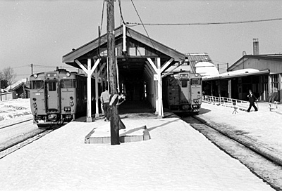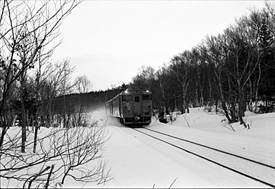 304D 急行天北 札幌行と交換 鬼志別 1989/2/11 先頭はキハ400でなくキハ56?27?(125)です。 |