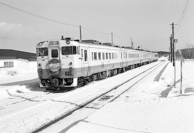 304D急行天北を見送ります。 鬼志別 1989/2/11 キハ400 142他5連 |
