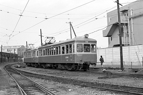 デハ701(外川方) 仲ノ町 1987/3/19 '28年製 元近江鉄道デユワ2101形を'41年鋼体化したモハ51 '61年片運転化P側2枚窓化 '78年譲受 両運化 2010年廃車 いすみ市にある「ポッポの丘」に保存 |