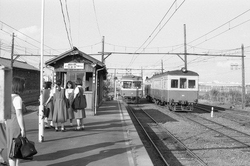 燕方面行モハ18が到着 東関屋 1988/9/1 可愛らしい女子高生がたくさんホームにいて恥ずかしかった。。。 |