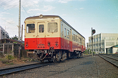 キハ811(土浦側) 真鍋 1983/10/30 '62年製 元雄別鉄道キハ104を'70年の雄別鉄道廃止により譲受 ’87年廃車 なお812は事故により'86年廃車 また813は片運転台で常総線に転入 真鍋機関区の現在の状況 |