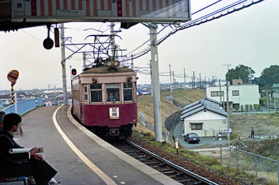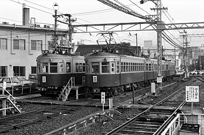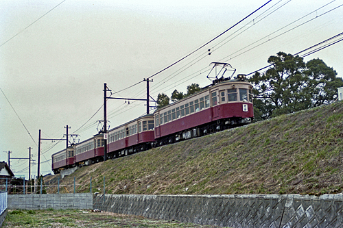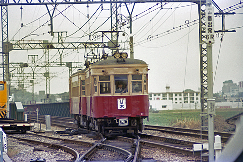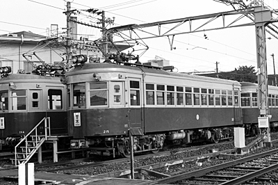大学入学を目前にした春休み、初めて九州の地を踏みました。私が訪問した時代には西鉄本線は釣掛車は姿を消しスマートな電車ばかりでした。なので入線してきた、まるで別の地方私鉄かのような古めかしい甘木線の200形を見たときは大変感激しました。2灯化された前照灯はマイナスでしたが重厚ながら、タマゴみたいな小さな車体は可愛らしく、小型ながら3連、4連で爆走する姿はなかなかの迫力でした。 そんな200形は、'69年以降は橋梁の重量制限のあった甘木線専用となっていたわけですが、線路改良後の'89年に600形と交代して引退しました。唯一動態保存された216編成も'93年に廃車解体されました。 |