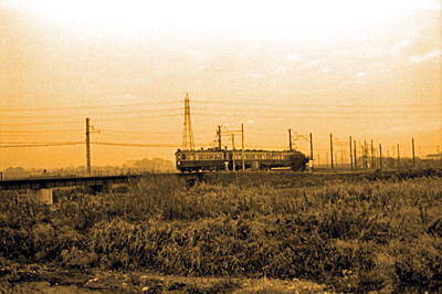 モ200形 甘木~馬田 1986/12/27 実際には夕日ではなかったと思います。大分薄暗くなり車内や人家に電灯が灯ってきて心細かったです。 |