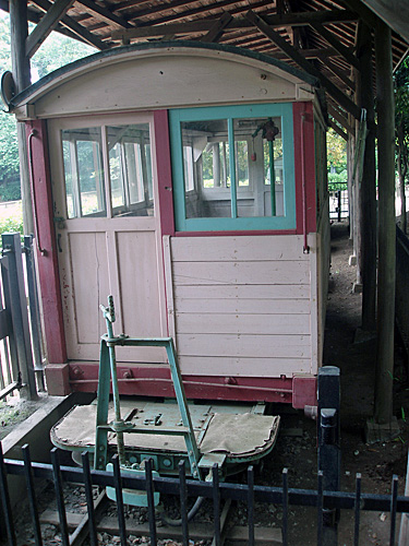 運材台車を挟んで客車が連結されています。 案内看板によれば形式「B大」定員15名。助六と車体に書いてあります。 |