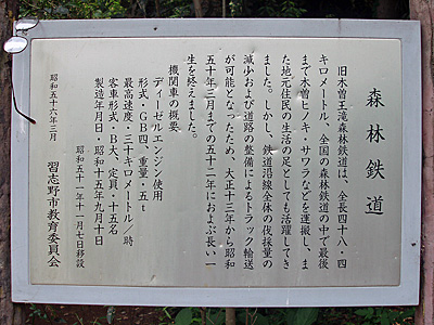 公園の展示看板 木曽王滝森林鉄道は'75/3廃止、翌年ここへ移設されました。 |